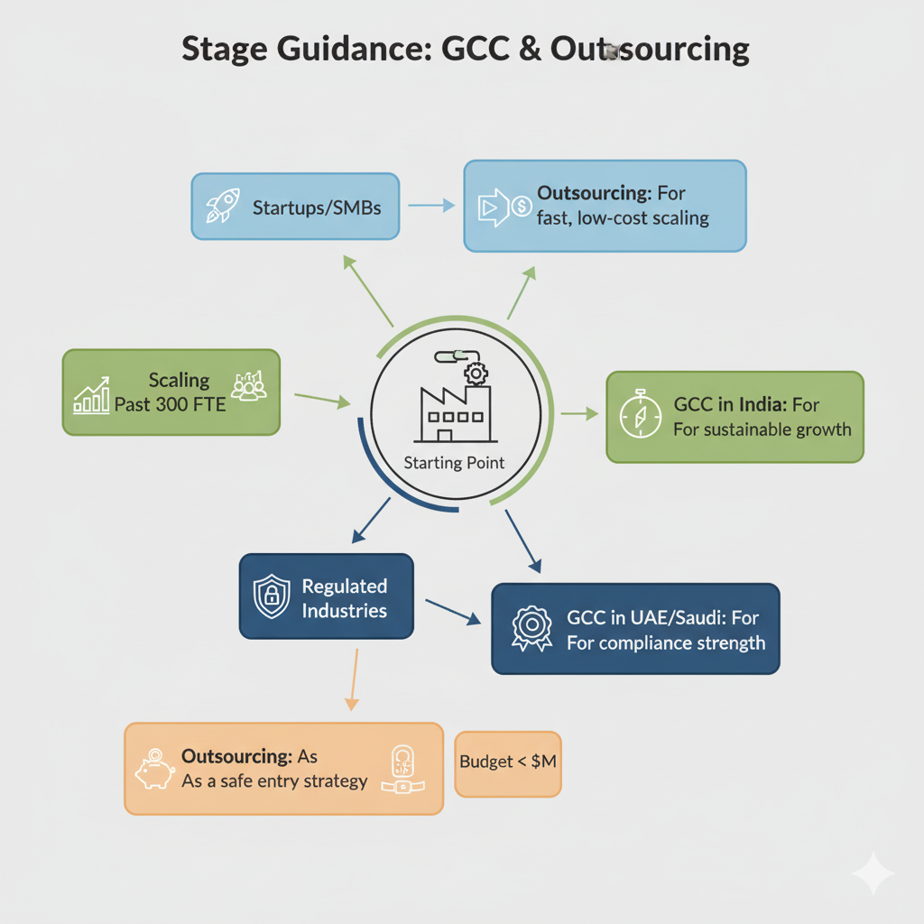High Budget GCC – Ideal for R&D, regulated industries, sustainable scale. Hybrid – GCC for strategy + outsourcing for efficiency.